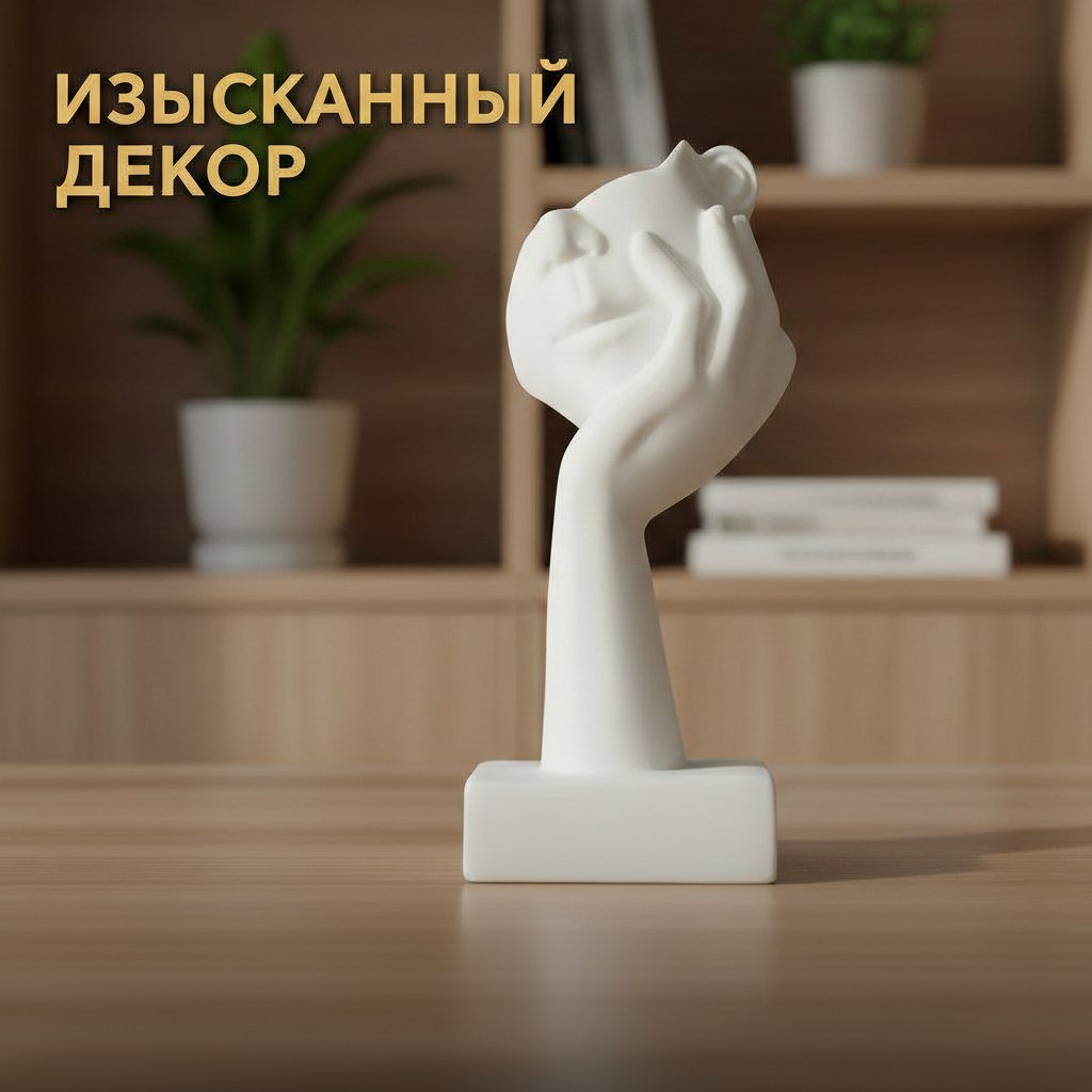 Изящная декоративная статуэтка в минималистичном стиле: белая фигура руки, поддерживающей стилизованное лицо. Элегантный акцент для интерьера — украсит полку, стол или рабочий кабинет. Сочетает лаконичность и художественную выразительность, добавит нотку утончённости в любой дизайн.